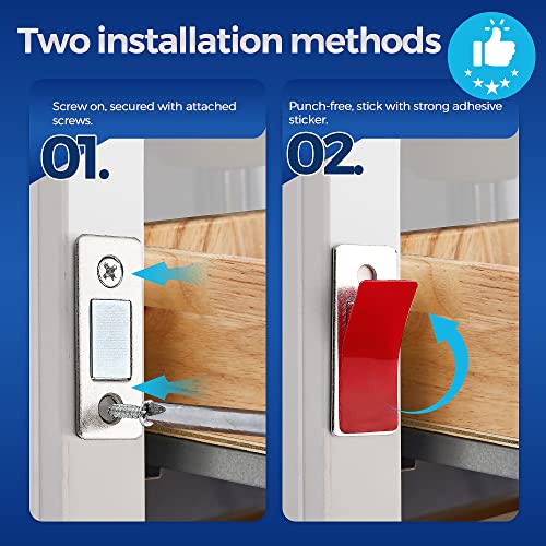 • Easy to install: The magnetic cabinet catch can be easily installed using screws or adhesive tape. Tips: Wait for 30 minutes, after the magnetic door latch was sticked.