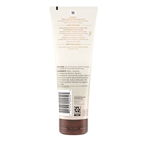 - 8-ounce tube of Aveeno Tone + Texture Renewing Body Scrub gently exfoliates dull surface layers to smooth bumpy, rough skin and reveal a more even skin tone in just one week